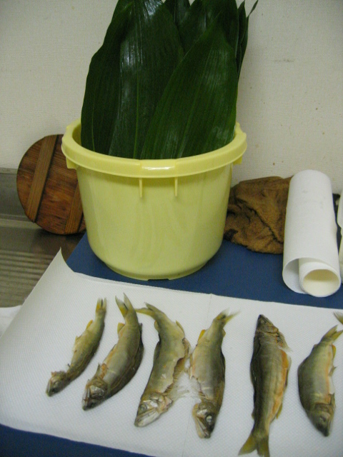 11/27 夏に友人から頂いた鮎を塩漬けしておいたものを、今日鮎鮨にすべく漬け込みました。所謂、なれ鮨というもので琵琶湖の鮒鮨が有名ですが、鮎も美味しいです。塩漬けしておいた鮎をご飯で漬け込むのですが、醗酵を促す為に麹を少しいれました。緑の葉っぱは「バラン」です。「バラン」というと弁当に入っているプラスチックでできた緑色のギザギザに切ってあるものを思い浮かべますが、実は植物の名前です。 子供の頃は実際にこの葉っぱを切って料理の仕切りに使っていた覚えがあります。バランには殺菌作用があるそうです。正月には美味しく食べられると期待して保存します。 |